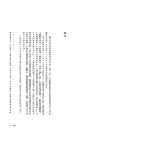 在柏林動物園這一帶的小樹林裡,確實發生過太多的事情,準確地說,幾乎沒有什麼可能發生的事情還沒有在這裡發生過。警員們神情淡漠地聽他講述,其中一位不聲不響地拎著塑膠袋站到一旁,繼續完成手頭的工作;過了一會兒,第三位員警停下腳步站到他們身邊聆聽,其他人隨即將其單獨留在了那裡。然而,年輕人還是鎮靜不下來。他又如此這般地給這位新面孔的警官覆述剛才發生的事,彷彿在每個細節裡都包含了另外一百個細節,彷彿他所說的每句話都需要做進一步的解釋,而每句解釋都會揭示出石破天驚的駭人祕密,與此同時,他悄悄隱藏了自己的祕密。