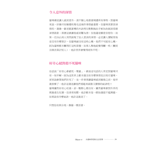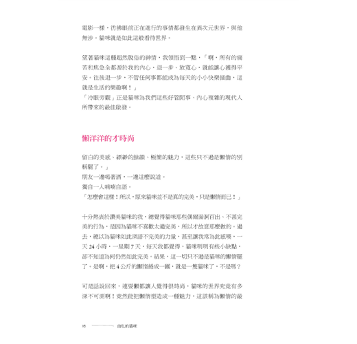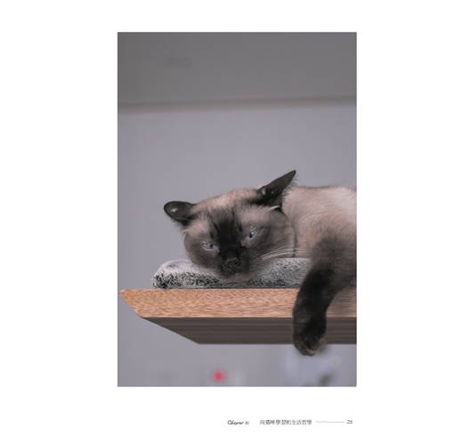 望著貓咪這種超然脫俗的神情,我領悟到一點,「啊,所有的痛苦和焦急全都源於我的內心,退一步、放寬心,就能讓心獲得平安。往後退一步,不管任何事都能成為每天的小小快樂插曲,這就是生活的樂趣啊!」