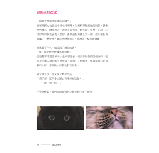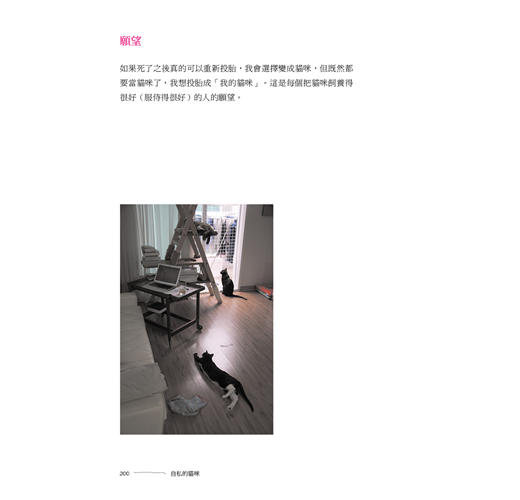 所以我下定決心要像「自私的貓咪」一樣,堂堂正正地變「自私」,卻又充滿魅力。像貓咪一樣認識「自己」、珍惜「自己」、保有不受任何人影響的「自己」。所以這本書誕生了,雖然不知道貓咪會不會坐在沙發上一面看著我的原稿,一面說著「哎喲,不錯喔!」來嘲笑我。坦白說,直到現在,我依然無法活得像貓咪一樣從容自在。還是一樣焦躁、為了小事感到受傷、嘟嘴、跺腳,為了其他人而放下自我。每當陷入這種時刻,我都只能把頭壓得低低的,希望視線不要對上躺在一旁用眼神說「嘖嘖,完全沒有進步嘛!」的貓咪。即便如此,還是下定決心,總有一天,我會的!