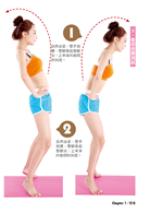 2、自然站姿,雙手插腰,雙腳微起墊腳尖,上半身向後仰約30度。