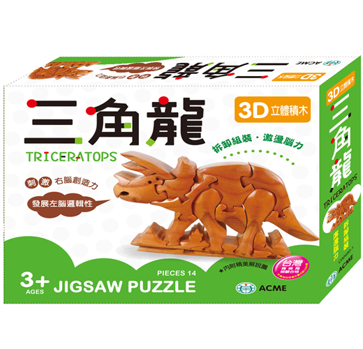 本產品以14塊積木塊拼組成一隻三角龍,造型生動、可愛,不但可以激盪腦力、訓練手眼協調和邏輯概念,還能當作擺飾,是一項值得收藏的益智玩具。