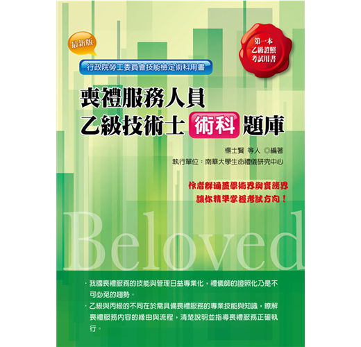 術科題庫全新改版,依照勞委會公佈最新考試題型修訂:最新答題寫法、現場實作流程及奠禮會場佈置標準