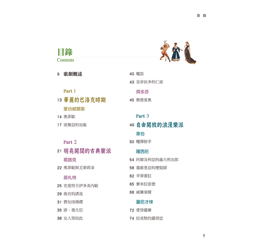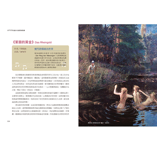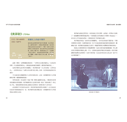 17世紀以來,大師級的作曲家和詩人把豐富的文化內涵和生活精神,融入音樂與劇本中,使人們在絢爛的表演舞台上,看見亙古不變的人性情感。莫札特逗趣熱鬧的《費加洛婚禮》、華格納震撼樂壇的史詩鉅作《尼貝龍根的指環》、威爾第的《茶花女》、《阿伊達》、比才濃烈熱情的《卡門》、理查‧史特勞斯的《玫瑰騎士》、《莎樂美》,還有絕不能錯過的20世紀歌劇大師浦契尼的《杜蘭朵公主》、《蝴蝶夫人》、《阿伊達》……等。你可以在其中找到生命最愛的歌劇故事,也可以從中找到你的生命故事。