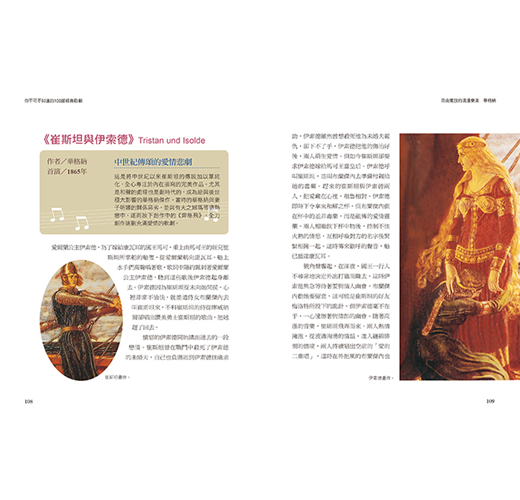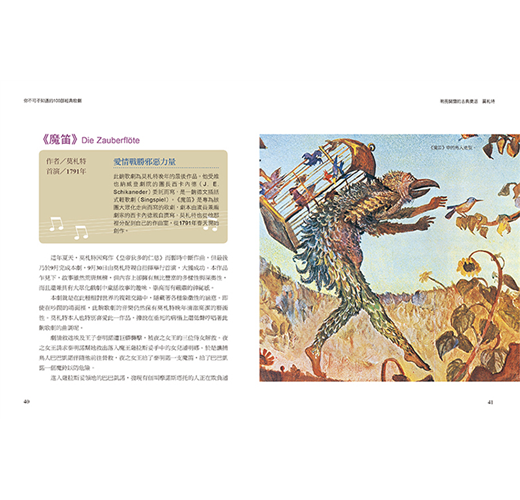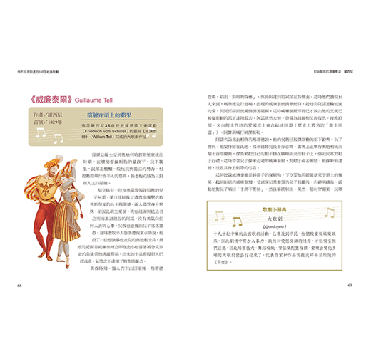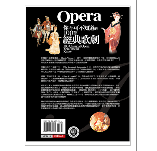 《你不可不知道的100部經典歌劇》全新彩色修訂版本,加入精彩劇照、人物造型、舞台布景及作曲者生平介紹,充分呈現出歌劇文化內涵與藝術表現。本書如同領航員般,深入淺出地帶領讀者跨越時空和文化藩籬,進入100部歌劇雋永流傳的情節與音符之中。