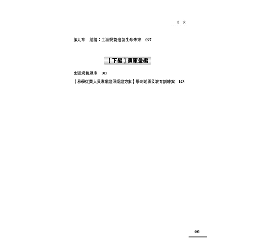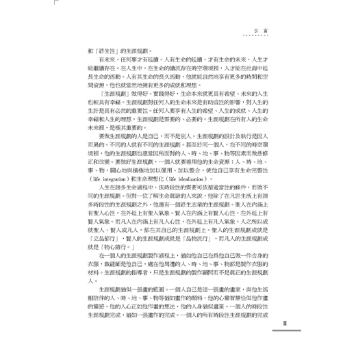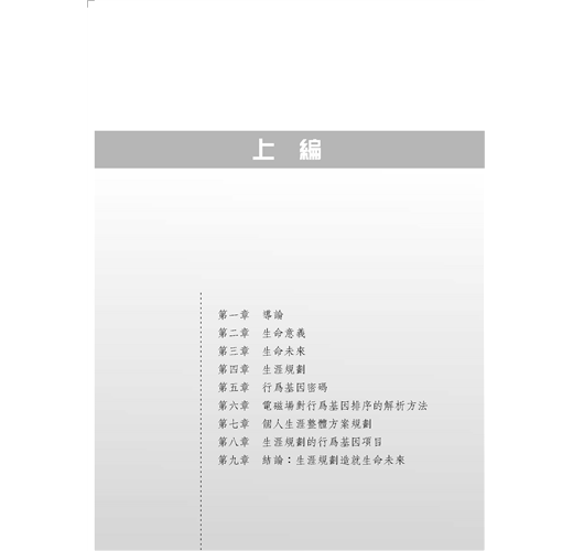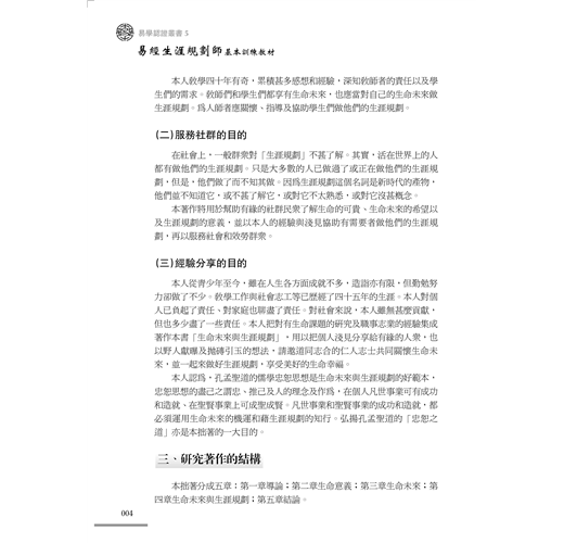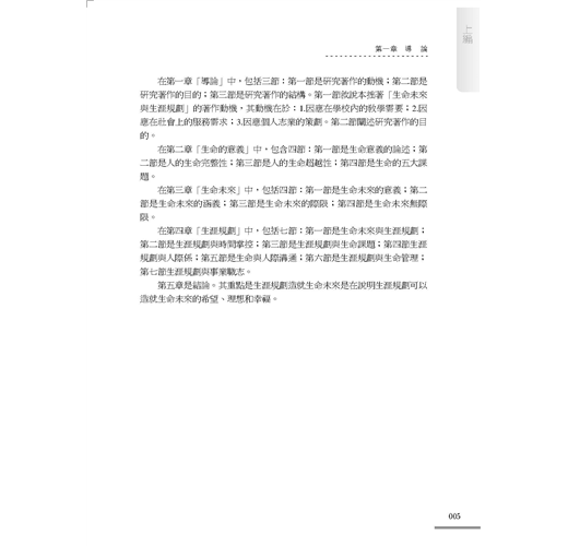 本拙著分成五章:第一章導論;第二章生命意義;第三章生命未來;第四章生命未來與生涯規劃;第五章結論。