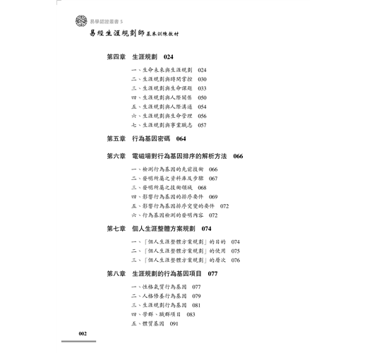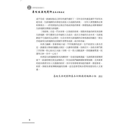 本書是生涯規劃師基本訓練教材,容或有偏頗遺漏,也請授課老師傳授當下,能適時補充異見並賜教之,但也給我們編輯團隊掌聲鼓勵。尤其重要的是本叢書另有人文通識的教材,其中有易學專業知能的篇章,都是學者、教授、律師及專家殫精竭慮的佳構,這也是學習風水管理者應有的人文素養。