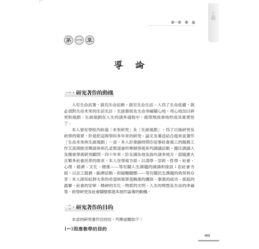 本人曾在學校內教過「未來研究」及「生涯規劃」,為了以後研究及教學的需要,於是把這兩學科多年來的研究、論文及著述結合起來並著作「生命未來與生涯規劃」一書。本人於業餘時間亦從事社會義工的服務工作又長期接受聘請參與孔孟聖道會所舉辦學術系列演講活動,擔任演講人及儒家學術研究顧問。四十年來,於全國各地及海外諸多地方,面臨廣大且繁多社會民眾的需求,本人在學術方面,以道學、宗教、哲學、社會、心理、經濟、文化、健康噎噎等有關人生課題的演講和座談;在社會方面,以志工服務、賑濟活動、和疑難關懷噎噎等有關民生課題的效勞與分享。本人深知社群大眾的希望與需要是職業的獲致、事業的成功、家庭的溫馨、社會的安寧、精神的文化、物質的文明、人生的理想及生命的幸福等。教學研究及社會關懷都是本拙作論著的動機。