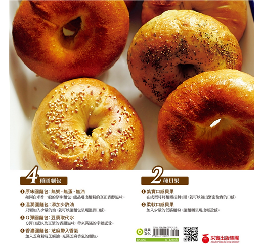 圓圓胖胖、表面微亮的可愛貝果,讓人難以抗拒。貝果有各式各樣的作法,可以利用成分的調整或發酵的時間,做出口味上的變化,請試著挑戰製作紮實及綿柔兩種不一樣的口感。