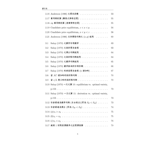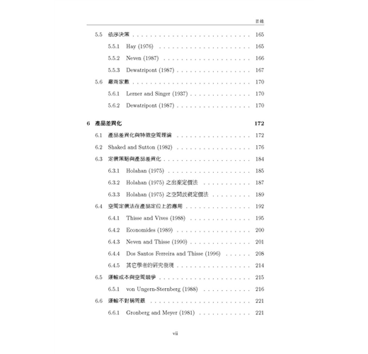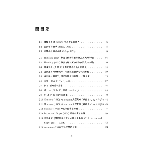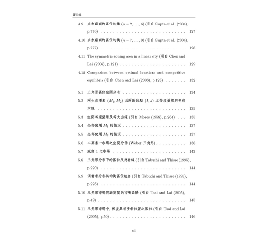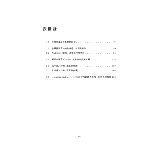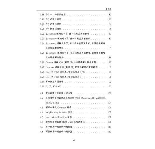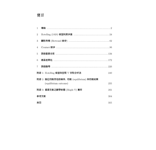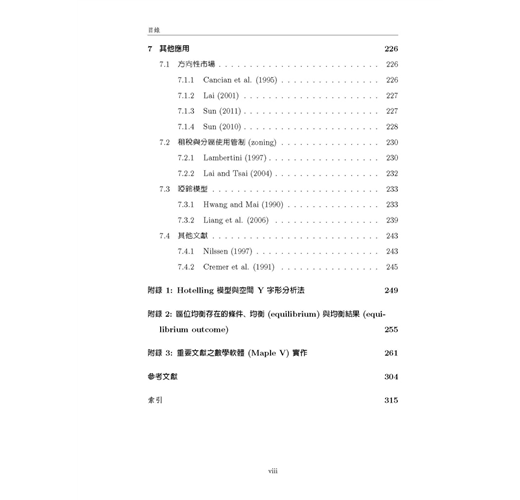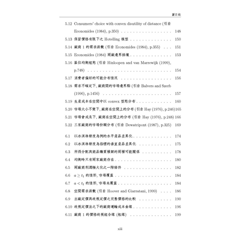 本書為方便讓讀者易於與原始文獻對照,所有數學符號均盡量依照原始文獻的用法與定義,這樣的作法對於碩、博士班學生而言很方便,但對於大學部學生,或是僅想概略瞭解區域經濟學的讀者而言 ,可能會有符號混淆之感,但是作為專業學術書籍,作者只能選擇做某種取捨,此點懇請讀者見諒。本書的「附錄 3」是部份文獻的模型求解過程 ,我們以著名的數學軟體 Maple V實際操作文獻中的數學模型,讓初學的讀者可以從程式當中,印證文章的模型是如何建構與求解,希望讀者自己動手求算一遍,可以更徹底瞭解文獻的數學模 型。本書如做為大學部課程用書時 ,請授課教師盡量著重在各文章的經濟意義與其主要結論 ,至於數學模型部分,可斟酌學生程度做適當的取捨,建議選擇書後附有完整數學附錄的文章為主。修習「產業經濟學」的學生,也可以從本書的第二章及第六章,獲得有關水平產品差異化的相關文獻介紹。