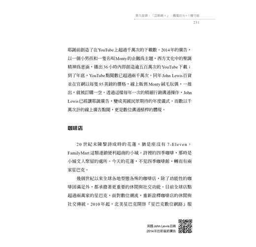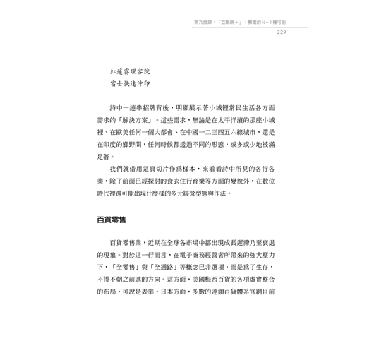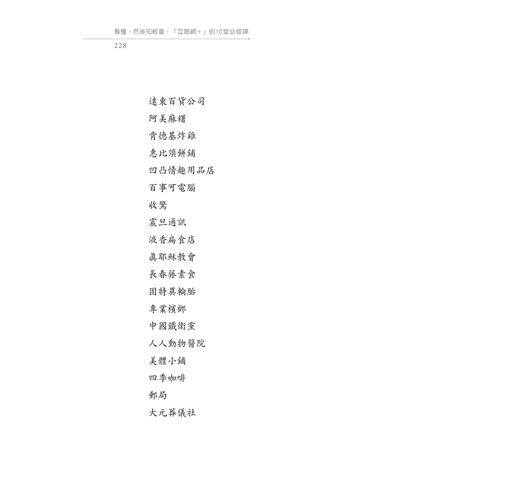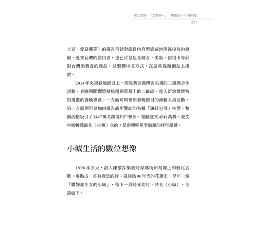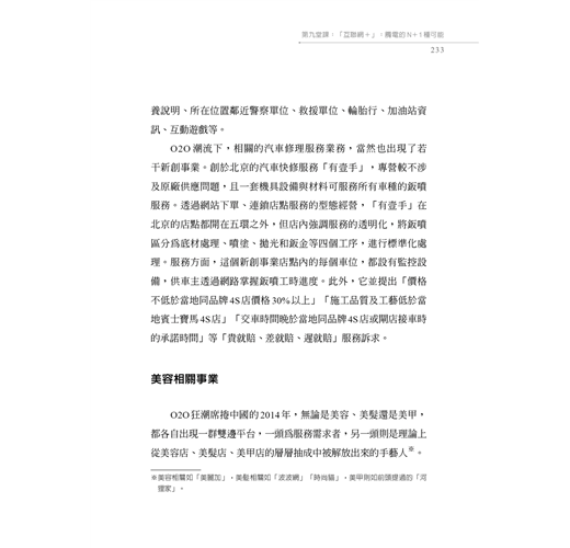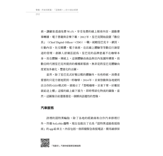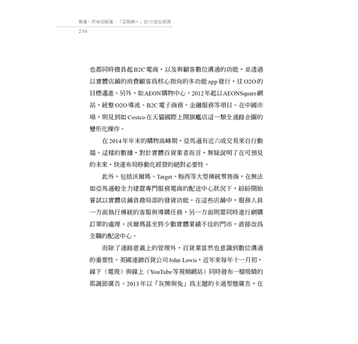 前言 第一堂課:偶然與必然 ◎歷史的偶然 ◎歷史的必然 ◎對於萬物重新想像 第二堂課:時、勢、人 ◎不同世代的觸網經驗 ◎新經濟、新邏輯 零邊際成本的免費∕資訊要求自由∕注意力經濟∕信任經濟,也是共享經濟∕消費者身分多重化∕使用者為王∕唯變不變 ◎世界到底平不平? ◎萬山不許一溪奔 第三堂課:平台、平台 ◎平台不是新玩意兒 ◎正或負?這邊還是那邊? ◎養大一個平台 聰明的雙邊訂價∕精簡為上∕就是要不一樣∕從利基做起∕鞏固核心槓桿業務∕市場包絡與反包絡 ◎數位平台的特性 高效連結與媒合∕多樣的附加服務∕收益方養不大,平台就難做大∕信任經濟的基礎 ◎數位平台ing 產品平台化∕平台移動化∕譜寫變奏曲∕經營生態圈 第四堂課:數位行銷溝通 ◎「推」著溝通∕「拉」著溝通∕「傳」著溝通∕「動」著溝通∕「釋」著溝通 ◎三種媒體效果 ◎AISAS 第五堂課:SoLoMo新世界 ◎社交與移動 ◎雙元的平行世界 ◎玩轉SoLoMo 以二維碼為主軸∕以GPS為應用主軸∕以Wi-Fi為主軸∕以Beacon為主軸∕以擴增實境為應用主軸∕以移動支付為應用主軸∕以硬體裝置連上社交平台為應用主軸 第六堂課:電商面面觀 ◎包羅萬象的「電子商務」 ◎電子商務的綜合維他命 分析力∕展店力∕商品力∕溝通力 ◎虛實大不同 服務樣態∕成本結構∕競爭環境 ◎他們統統都猜錯:電商相關迷思 所有位子都被占據了,後進者已無空間∕戰場是平的,人人都可分杯羹∕價格是競爭利器,同商品的售價差異在網上大幅減少∕類比時代的經營經驗很重要∕線下的客源可以順利移轉到線上∕集中資源服務少數高貢獻度顧客∕成功有方程式可循,可以複製∕※ 亞馬遜你學不會 第七堂課:看懂O2O ◎我說的電商,和你做的電商不一樣 ◎何謂O2O? ◎常見的幾種O2O模式 自有營運的線上線下整合模式∕網路原生平台主導串連線下夥伴模式∕本地生活型O2O模式∕ 線上導流到店型O2O模式∕社區型O2O模式 ◎作為一種數位槓桿的O2O ※ 蘇寧的選擇題: 等死還是找死? 第八堂課:數據與大數據 ◎由少而多,由慢而快,由簡而繁 ◎數據打哪兒來 ◎數據分析能幹什麼 從串流音樂服務挖掘選民偏好∕靠數據分析提高贏球機率∕我知道你的閱讀習慣和癖好∕一塊兒考試去∕據說春運∕33,27,37∕螞蟻雄兵∕匹配指數 ◎物聯網的美景 ◎數據分析的限制 第九堂課:觸電的N+1種可能 ◎亙古的需求,創新的需求滿足模式 食∕衣∕住∕行∕育∕樂 ◎小城 百貨零售∕咖啡店∕汽車服務∕美容相關事業∕葬儀∕宗教∕政治 ◎互聯網金融 第十堂課:看懂,然後知輕重 ◎舉重若輕的數位槓桿 成本結構決定的營運彈性槓桿∕線上線下統合的槓桿∕突破地理範疇的槓桿∕行銷溝通的槓桿 ∕數據分析的槓桿 ◎不一樣的經營假設 重新定義之必要∕接受失敗之必要∕忘卻標竿之必要∕永遠Beta之必要∕大膽選擇之必要∕ 順勢出格之必要∕合縱連橫之必要 ◎台灣的「數位空洞」 ◎下一站: 想像