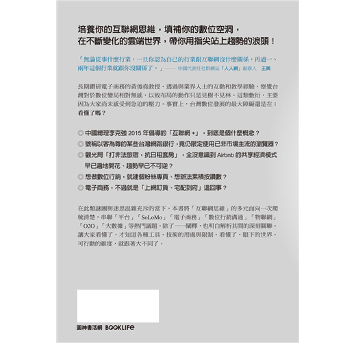 此類謎團與迷思混雜充斥的當下,作者將「互聯網思維」的多元面向一次爬梳清楚,串聯「平台」「SoLoMo」「電子商務」「數位行銷溝通」「物聯網」「O2O」「大數據」等熱門議題。除了一一闡釋,也明白解析其間的深刻關聯。讓大家看懂了,才知道各種工具、技術的用處與限制。看懂了,眼下的世界、可行動的維度,就跟著大不同了。