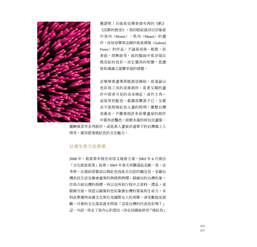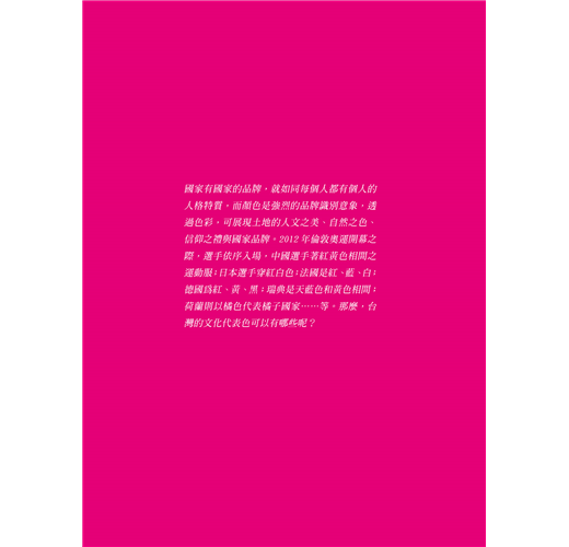 「品牌法國」是介紹法國三百年來品牌建立的過程,「品牌台灣」則對照品牌法國,以我個人所體會,敘說已落實在文化政策及行動方案中的原理。「文化意象」是以國家、全民的高度思考如何為台灣建立「品牌意象」,並分別以「台灣紅」「台灣青」「台灣金」進行全民運動的歷程,它是現在進行式,也是我將以畢生之力推動的理想。「文化空間」則以臺灣歷史博物館、兩廳院綠牆,以及南投由基層啟動的桃米社區分別說明文化載體的精神與意涵。「文化服務」則以2009 年高雄世運會闡述如何把握上天賜予的機會,乘勢將台灣推向國際;粉樂町則是民間團體如何響應國家政策所推出的創意空間,創造由下而上的無窮生命力;而晁陽的創意綠產業則指出台灣已打破農村既有的形式,以二十一世紀普世價值為基礎創造出未來的產業,將成為實踐綠文化生活的濫觴;最後以鋼鐵產業的翻轉、漆器產業的再生,與大家分享眾人努力的成果。最後一篇蘇文鈺教授親自執筆的〈過河〉,則是學術、產業與眾人之力的集合,從社會底層結合教育邁向「社會企業」的案例,文中敘述如何改變腦袋,如何透過集資平台達成目標,以及一路走來所遇到之困難和解決的方式。這十四篇文章幾乎是多年來我所堅持的「原鄉時尚」核心價值的展現,邀請大家分享。