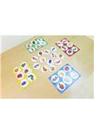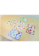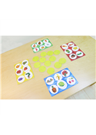 每位孩子拿取不同顏色的遊戲板,並將所有的圖卡正面朝上。遊戲開始,孩子輪流拿取圖卡,放在遊戲板對應的圖案位置上,最快收集到6種圖卡就是贏家。