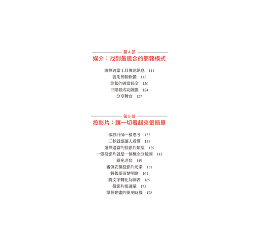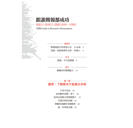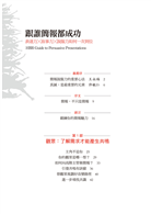 本書在編排上短小輕薄,沒有太多華麗或全彩的圖片。但是「外行看熱鬧,內行看門道」,希望有意強化簡報說服力的讀者,能進一步吸收簡報天后的核心精華,幫助大家站穩自己的簡報舞台,進而影響別人,改變世界。我想,這才是這本簡報心經最重要的目的!