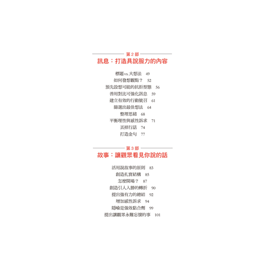 還有些人有想法、有親和力,卻常為了如何措辭而腸枯思竭,他們迷失在自己製作的一頁又一頁的投影片大海之中,經常還沒講到重點,簡報時間就結束了。最令他們煩惱的是,在大家轉身離開會議室時,他們心裡卻根本沒把握是否說服了任何...