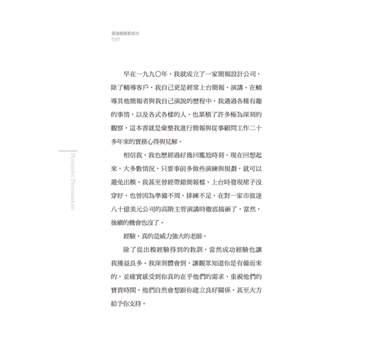 幾年前,當我開始在各大上市公司教導專業簡報技巧時,簡報這一門學問還沒有受到太多刻意的關注,市面上的簡報書籍,要不是過度集中於投影片軟體操作,就是過度偏向口語技巧。真正以簡報準備、設計、製作、演說的完整流程做為核心的書籍,可說少之又少。