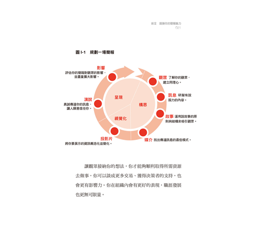 從了解「觀眾」開始,到組織「訊息」,發展「故事」,然後是選擇傳播「媒介」與「投影片」的製作,最後,透過有力的「演說」,對你的目標觀眾發揮最大的「影響」。整個過程,包含了「構思」、「視覺化」、「呈現」等三大階段,完全與我們在簡報實務上的應用架構不謀而合。