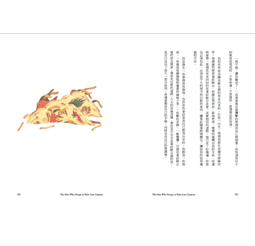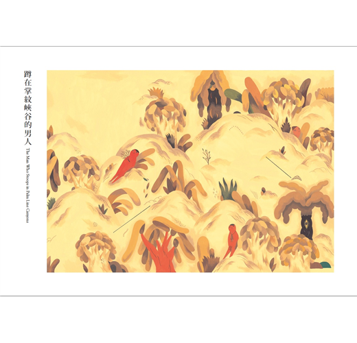 〈蹲在掌紋峽谷的男人〉男孩看著自己的掌紋,發現裡面住了另一個自己,在一連串的對談後,漸漸了解自己命運的走向