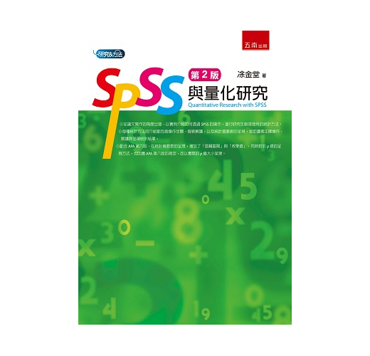 本書主要分成兩個部分:第一個部分主要介紹量化資料的整理,包括資料輸入與檢核、反向題的分數轉換、組別的整併、分數的加總等議題,這些議題是進行統計分析前的準備工作;第二部分則介紹SPSS的操作步驟,用以進行統計方法的考驗,此部分主要介紹研究生較常採用的統計方法,包括描述統計、 t考驗、單因子變異數分析、雙因子變異數分析、積差相關、典型相關分析、多元迴歸分析、卡方考驗等。