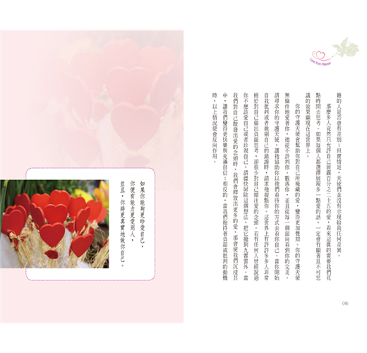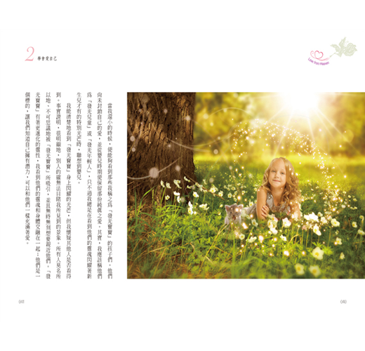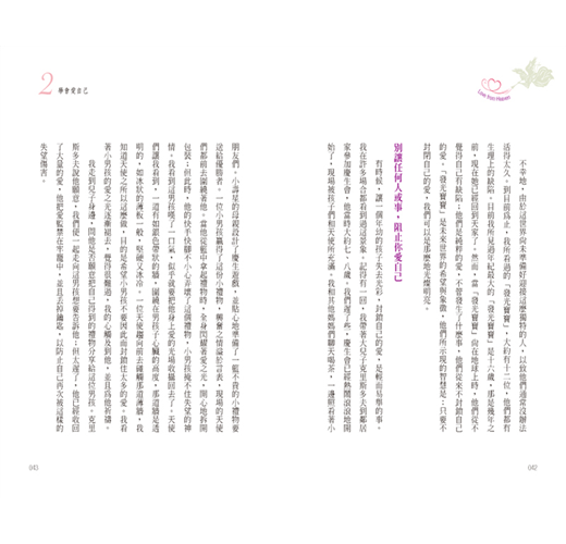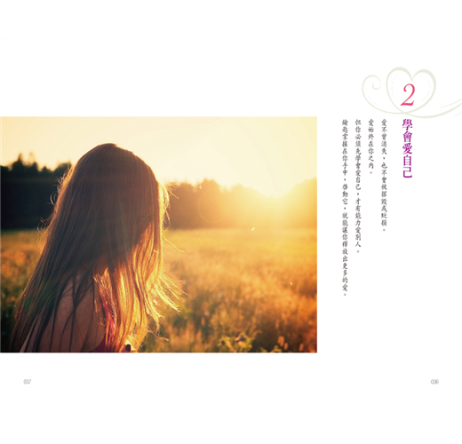 如果我們能像自己降生時一般,再度散放著純淨的愛之光,我們就有能力活在一個全然不同的世界裡。我們會感受到信心滿滿,並知曉自己的天賦。珍愛自己不會是徒勞無益的,也不是自私的表現,或者認為自己比別人更特別。對自己的愛,表現在珍視自己的價值,並愛著本然的自己。沒有人是完美的, 你不是,我也不是;但如果我們能夠敞開心胸愛自己,我們便會聚焦在自己享受與擅長之處,而不會總是憂心自己不專精的地方,或不斷地感受到自己的不足。我們會減少對自己和他人的批判和負面評價,也不再那麼想要贏過別人, 和別人比較,如此一來,忌妒、自私、貪婪會離我們愈來愈遠,我們的人生就會簡單許多,更加愉悅知足。