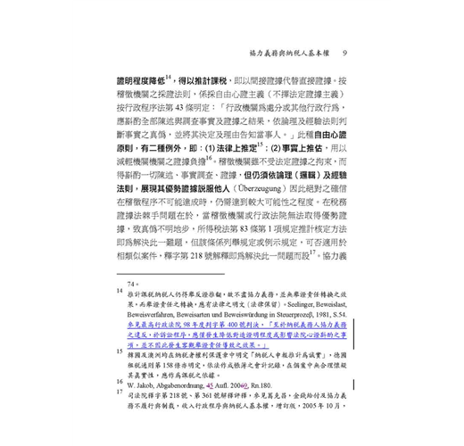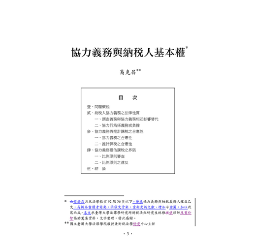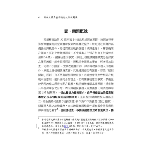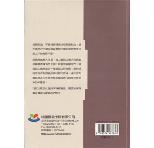 稅捐人員、會計師、稅法學術、行政執行和行政法院判決最重要的參考,繼2010年《避稅案件與行政法院判決》之後,2011年由台大法學院稅法學研究中心大師葛克昌教授主編、主撰的《納稅人協力義務與行政法院判決》,集結國內各界稅法專家,合為一書。