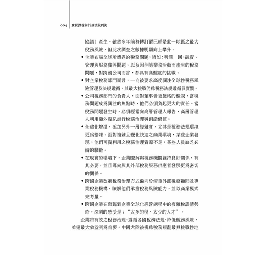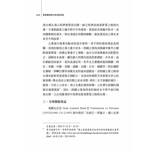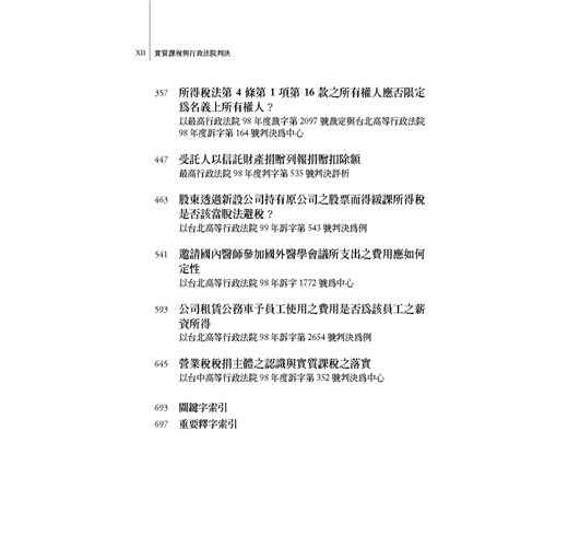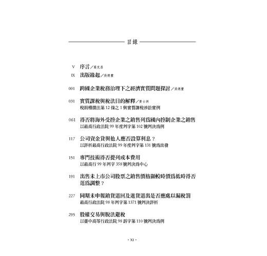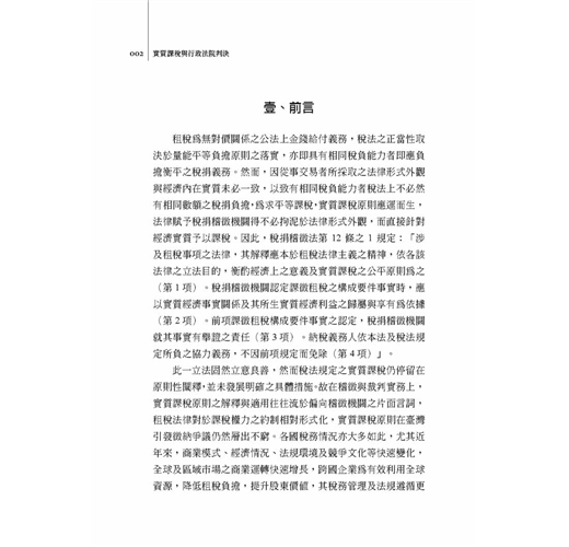 有鑑於實質課稅原則在稅法適用,攸關自由憲政國法治品質,臺灣大學法學院財稅法研究中心,精選稅捐稽徵法第12條之1實質課稅原則立法後,行政法院判決十餘則,由臺大法研所財稅法組及會計研究所之碩士生整理原被告見解,及法院判決主要法律見解,並置之同類判決比較與學說予以分析,每一個案均由一位專業會計師、專業律師予以指導,其間或有國稅局長、賦稅署長、行政法院法官及大陸稅法學者共同討論,各長官不僅親臨指教,更對不同意見予以高度寬容,其人格風範更值吾人學習。本書即為一學期每周三小時,青年學子與專家學者共同激盪之實錄,用以見證在稅法開墾時期之法治園丁之耕耘過程。出書之際,賴蔡孟彥老師領導高羅哦、陳佳函等研究生擔任編輯。本課程及出書,最需感謝資誠文教基金會,基於企業社會責任,在吳德豐副所長暨策略長、郭宗銘營運長及蔡朝安大律師領導下在人力財力上予以充分支援。以及翰蘆圖書對於出版工作的大力支持與配合。為不負大家支持與期待,我們一定堅持此種稅法教育之革新,與一系列重要判決研究之出版。是為序。