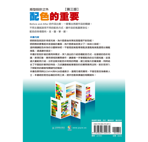 本書針對設計者的應用與需求,深入淺出的介紹各種配色方式,從基礎的色彩知識、表現印象、應用領域到實際操作,讓讀者一手掌握配色的全方面知識,並透過大量範例介紹,分析並解決配色中常見的問題,建立起強大的審美觀,同時結合了平面設計案例的特色,力求讓讀者能掌握色彩的實際應用法則,對於想深入了解配色的讀者有關鍵性的幫助。