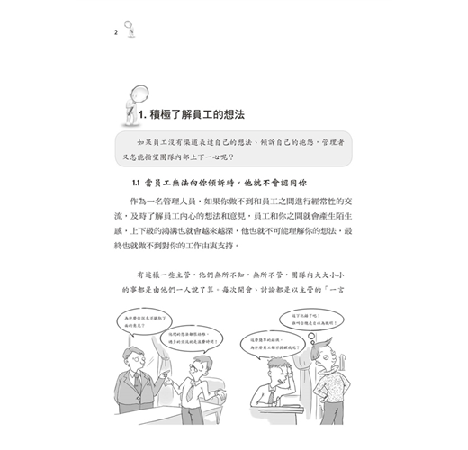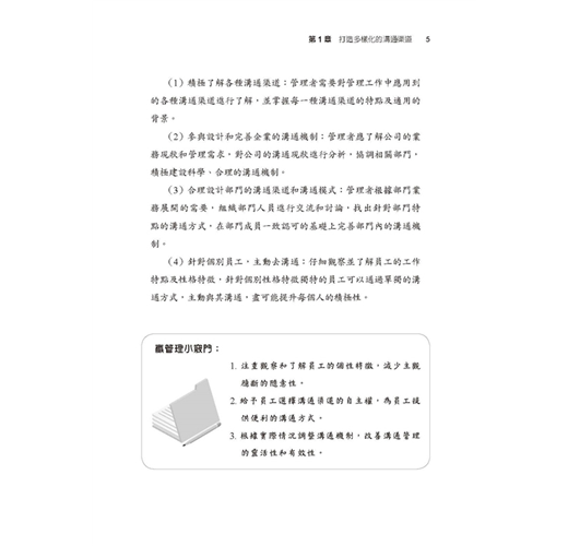 除此之外,本書還設置了一個「小思考」的部份,其用意在於讓管理者檢視管理工作中的問題,以達到查漏補缺、提升管理的效果。