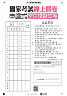 《國考線上閱卷申論式空白作答紙》為參加公職考試、專技考試之考生皆適用,內含4份申論式作答紙,是您考前模擬撰寫申論考題之最佳工具!