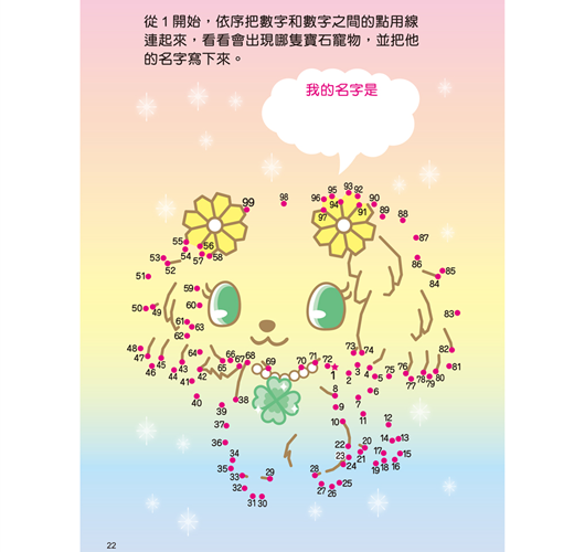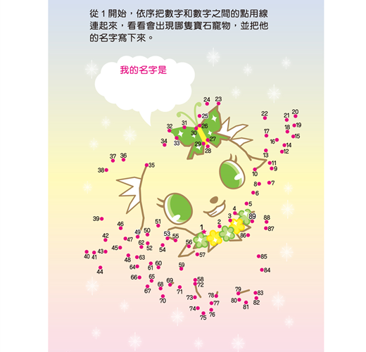 寶石寵物大集合囉!進入可愛的寶石寵物的世界,帶你認識不同的寶石寵物。請你跟著數字畫線連連看,就可以發現不同種類的寶石寵物了!每一隻寶石寵物的名字你都知道嗎?讓可愛的寶石寵物陪伴你,一起玩!