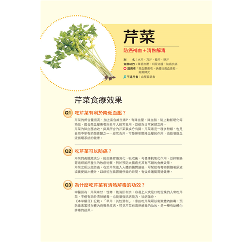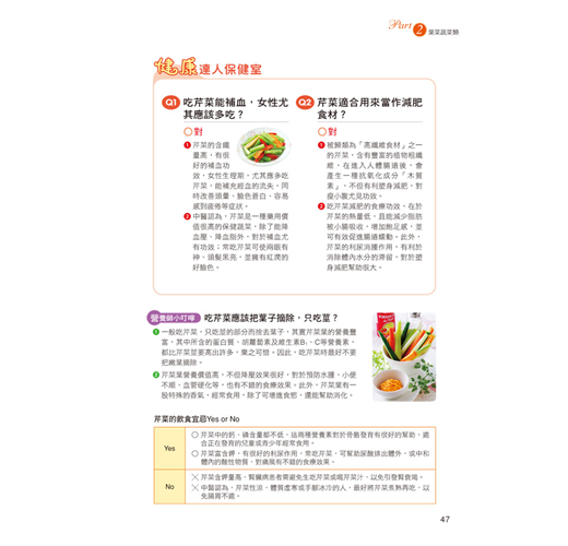 ◎本書以Q&A的形式,針對一般人對於食材的迷思,給予專業、簡明的回答,讓您輕鬆暸解食材的重點功效。特別為讀者設計的「營養師小叮嚀」單元,剖析食材烹調與搭配的關鍵,並提供最實用的建議。