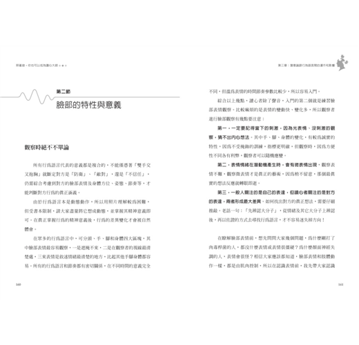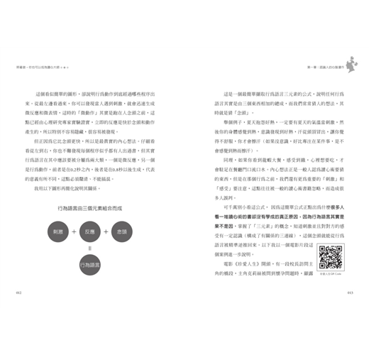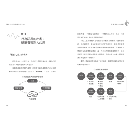 本書透過大量取材驗證彼此的共通性,讓大家能在簡單圖解和生活的說明裡,輕鬆了解人的心理運作邏輯,讓大家透過很簡單的學習,就能掌握到行為語言的奧秘,看到一個人的內心世界。
