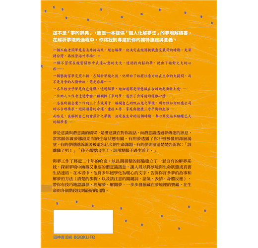 夢是意識與潛意識的橋梁,是潛意識在對你說話,而潛意識透過夢傳達的訊息,常常跟你做夢那段期間的生命狀態有關。有的夢透露了你不曾被懂的深層渴望,有的夢隱隱訴說著被遺忘已久的生命課題,有的夢則清清楚楚告訴你:「該離職了吧!」「孩子都要出生了,該用點腦子過生活了。」