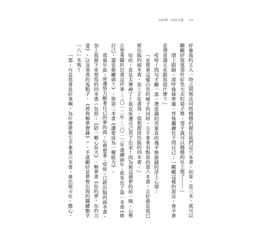 解夢,十幾年來,是我的情不自禁。工作坊裡,每回聽到成員說著新鮮上架的夢境,我總是奔奔奔烘烘烘的心跳!潛意識的訊息,總是驚喜;夢境的指引,總讓我深呼吸。終於,人生走到了這本解夢書,寫著,觸動又喜歡的同時,像是開挖著一山後...