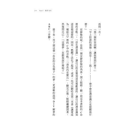 除了陪伴者自己唸引導詞之外,也可以準備好隨書附的CD,選好哈克進錄音室錄好的音軌一(解夢前的準備)或音軌二(活化潛意識),然後按下播放鍵就可以了。陪伴者一旦感覺到與主角有了一份親近安心感,就是可以朝階梯二「澄清夢境階段」走下去的時候了。