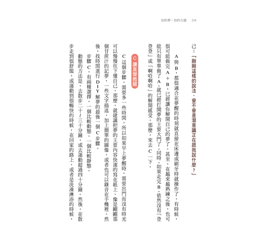 除了上頭這兩類問句之外,還有一件很好的事情可以做,那就是唸一段這本書附錄裡的「解夢前的準備」或「活化潛意識」給夢的主人聽。陪伴者可以配著自己選擇的輕音樂當背景,然後用自己的聲音慢慢的、溫和的唸給主角聽。