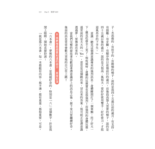 特別精采與珍貴的是,書中整理了哈克帶領解夢工作坊的實境生命互動。心理諮商是生命影響生命的歷程,閱讀這些互動的對話語錄,不妨想像著哈克獨特專注又熱情的口吻,在凝視生命的當下,帶著關愛,呼應著夢境關鍵字詞,回應出一句句流暢又扣人心弦的話語,在停頓中呼吸共振與深入思考,搭配著量身回應的歌曲,彷彿親臨充滿愛與感動的現場,大呼過癮。在驚嘆之餘,我們不只見證解夢的喜悅,也同時得以臨摹學習,原來可以這樣陪伴一個人把夢解開啊。
