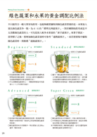 ★綠色蔬果汁的比例調配,還可依個人狀況從「新手蔬果汁」、「標準比例蔬果汁」、「進階蔬果汁」、「超級蔬果汁」來選擇符合自己能接受的蔬菜及水果的使用比例。