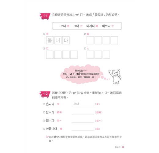 1-1在母音語幹後加上-ㅂ니다,改成「最敬語」的形式。