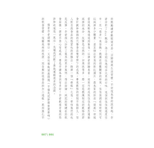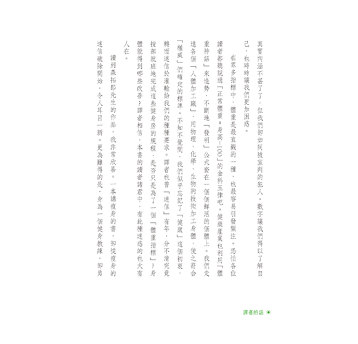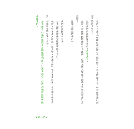 更不必說,絕大多數人對本書上面提到的那些熱量的計算都雲裡霧裡。因為世人連熱量的轉化機理都不了解,就算參考食物熱量是件好事,卻過分地執著於攝入的食物熱量,最終身體累積的熱量還是一筆爛賬。
