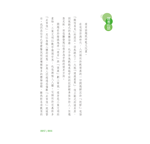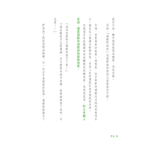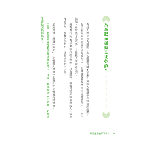 寫作本書的目的,就是打破讀者諸君對運動減肥抱持的幻想,指導諸君真實、有效、易行地減肥。