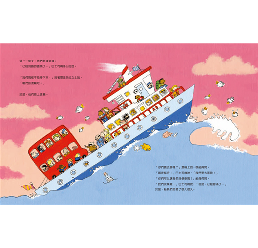 可不是嗎?我們可能很羨慕故事裡的巴士載著大家環遊世界,巴士上的每一層都留存了不同的地方特色,承載了不同生活型態的人們,讓我們跟著一起認識這個世界、了解各種文化。現實生活中,我們不可能天天去冒險、永不回到日常的軌道,但衷心期望:教育和閱讀,可以帶領未完成的我們、未完成的孩子,走向更多的可能性,讓我們與孩子的生活充滿希望、快樂和興奮。