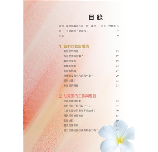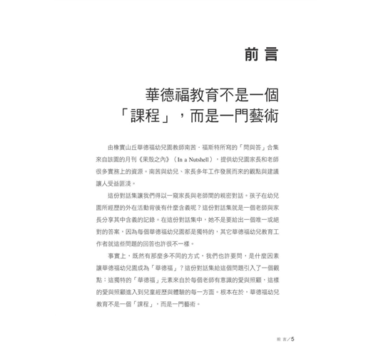 這本書收集了家長對華德福學校的問題,由資深教師歷經數年編纂而成。透過詳盡回答這些問題,清楚描繪出華德福教育的圖像,我們可以體會到更大範圍的愛的力量、教養的力量,以及成就一個人生命的完整。