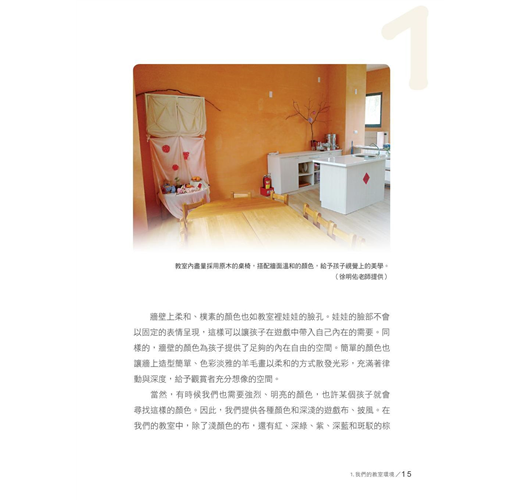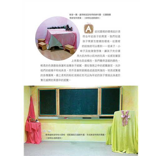 幼兒園裡的環境設計須符合年幼孩子的需要,我們知道孩子需要怎麼樣的環境。從園裡的設施就可以看到——低桌子、小椅子及能激發想像、讓孩子充分運用大肌肉和小肌肉的玩具。從感官層面上來看也是這樣的。我們覺得溫暖的顏色,輕柔的色調最能保護和滋養孩子細膩、還在發展之中的感覺器官,允許他們的眼睛平和地休息,而不是會對眼睛造成過度刺激的、明亮或繁複的各種圖案。牆上柔和的粉紅或桃紅色可以為年幼的孩子營造出身處於繁花盛開的果園中的感覺。