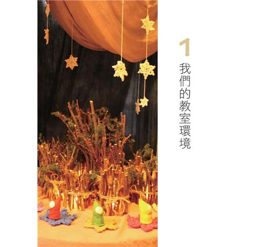 幼兒園裡的環境設計須符合年幼孩子的需要,我們知道孩子需要怎麼樣的環境。從園裡的設施就可以看到——低桌子、小椅子及能激發想像、讓孩子充分運用大肌肉和小肌肉的玩具。從感官層面上來看也是這樣的。我們覺得溫暖的顏色,輕柔的色調最能保護和滋養孩子細膩、還在發展之中的感覺器官,允許他們的眼睛平和地休息,而不是會對眼睛造成過度刺激的、明亮或繁複的各種圖案。牆上柔...