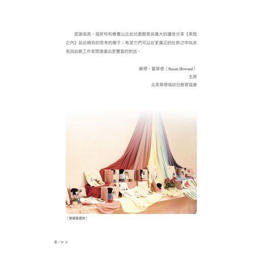 我是兩個女孩的家長,現在已亭亭玉立的她們小時候都在橡實山丘幼兒園上學。家長的角色總是充滿喜悅與幸福,但也總是面臨挑戰。我特別記得大女兒莎拉六歲時的一段時光,感覺那跟兩歲時的她相比,簡直是另一個人;那時的她愛挑釁人、容易耍脾氣,滿嘴都是「不!」。我對她完全沒輒,我需要建議。於是我打電話給南茜‧福斯特,那時候她是女兒的幼兒園老師。南茜聆聽我的挫折與擔憂後,很簡單地說:「那麼她兩歲時妳是怎麼做的呢?」我立刻明白了!我提出幾個想法,南茜給了我一些建議,鼓勵我試試看效果。我現在已經忘記細節了,但留在我心中的是那份感激,她思慮周詳的回應,她有效的建議,作為家長所感覺到那份尊重,也感覺到了她的支持。