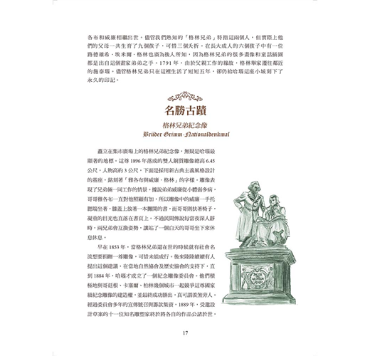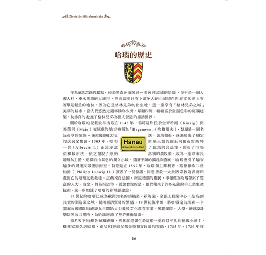 我們的旅程從兄弟倆的出生地哈瑙開始,那裡有一尊標誌性的格林兄弟雕像,象徵著童話之路的起點。他們在這座小城居住了5 年,又在施泰瑙度過了一段幸福的童年時光。在卡塞爾中學畢業後,兩人便一起去了馬爾堡大學攻讀法學專業。因為在學校裡接受了很多新興的自由思想,格林兄弟畢業後一直致力於德國民間文學的收集與傳播。他們在卡塞爾及周邊地區走街串巷,將一段段口耳相傳的小故事編集成冊,無意中成就了這部流傳至今的《格林童話》,並在1812年出版第一卷。現在,翻翻你的書櫃,看看還能否找到一本頁角發黃的《格林童話》?輕輕拂去塵土,把它塞進沉甸甸的行囊,帶著種種的興奮和期待,開始踏上一段充滿溫暖與感動的未知旅程吧!