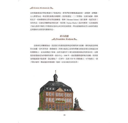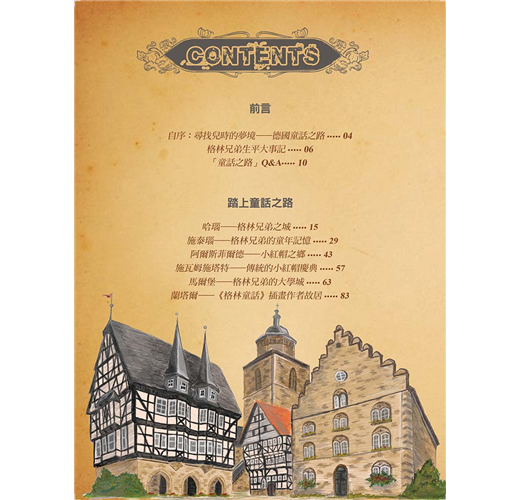 不過,何謂「童話之路」呢?那要從著名的《格林童話》說起了。我們不妨回憶起懵懂未知時的點點滴滴,你可曾躺在被窩裡央求媽媽一遍遍地講故事?可曾拿著畫筆在童話書上恣意揮灑?仔細回想,伴隨世代成長的《格林童話》像是循循善誘的師長,教我們善良與感恩,又像是調皮幽默的玩伴,帶給我們不滅的童真。也正因為格林兄弟為世界兒童文學所做的巨大貢獻,1975 年,德國聯邦政府專門規劃了一條名為「德國童話之路」的遊玩線路,以紀念二人誕辰200 週年。從南到北,從哈瑙到不萊梅,這段旅程途徑60 多個與格林兄弟生平及《格林童話》故事息息相關的城鎮鄉村,優美宜人的青山綠水,滄桑斑駁的古堡宮殿,秀麗雅致的木桁架建築⋯⋯那一幅幅猶如夢境般的景色,承載著漫長歷史的印記,閃耀著文化瑰寶的璀璨,被熱愛著童話、熱愛著家鄉的人們打造成一條綿延600 公里的奇幻盛宴。