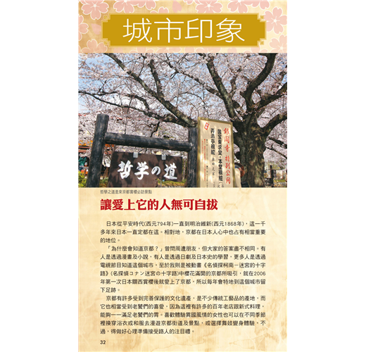 到日本關西賞櫻的首選地,由於京都範圍頗大,分為洛東、洛中、洛西、以及近郊洛北等區域介紹,四季皆美的京都,春有櫻花、夏有祭典、秋有紅葉、冬有白雪,不少的神社、寺院如:高台寺、八坂神社、平安神宮等都是取景好去處。來到0這,別忘了體驗和服、品嘗道地的宇治抹茶,或是單單選間喜歡的咖啡廳,與京都來個早餐約會。