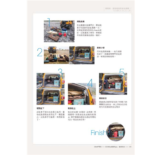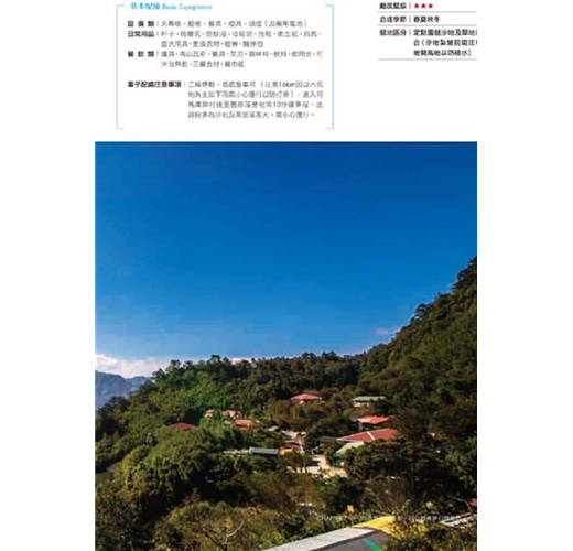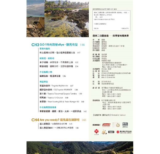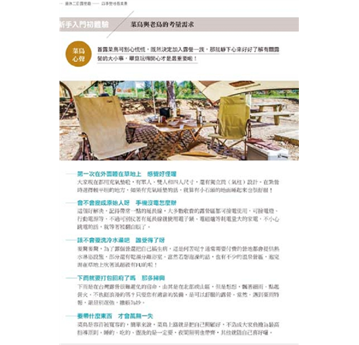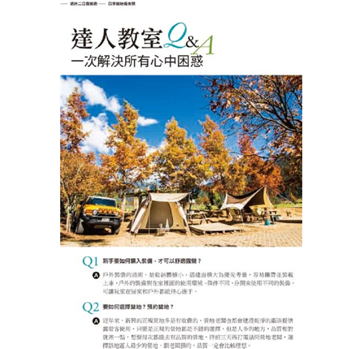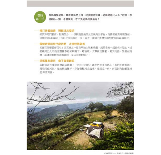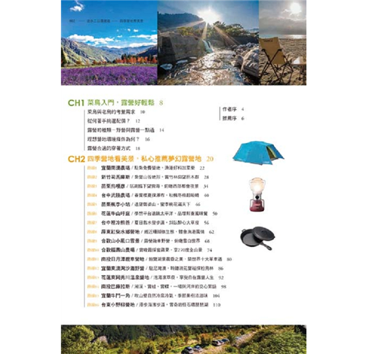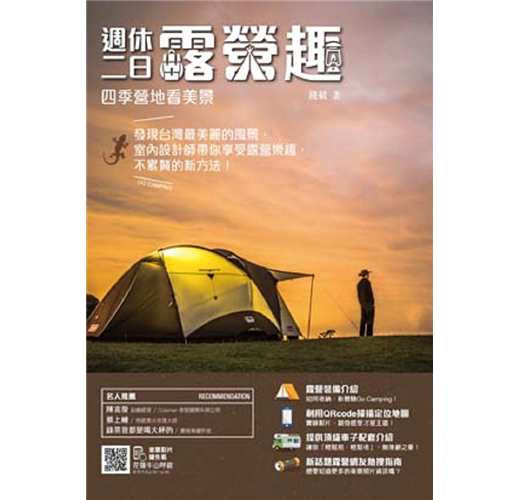 本書即是我露營的心得分享,除了露營裝備的介紹、如何收納的技巧外,最重要的當然就是不藏私的秘密露營景點大曝光啦!宜蘭天狗溪的荒涼蕭瑟對比武陵農場的繽紛浪漫,各有各不同的情調;苗栗烏嘎彥休閒營區與宜蘭南澳農場則是推薦給新手露友們可以先挑戰的地方,交通方便、又有免費的露營地,是很棒的選擇。